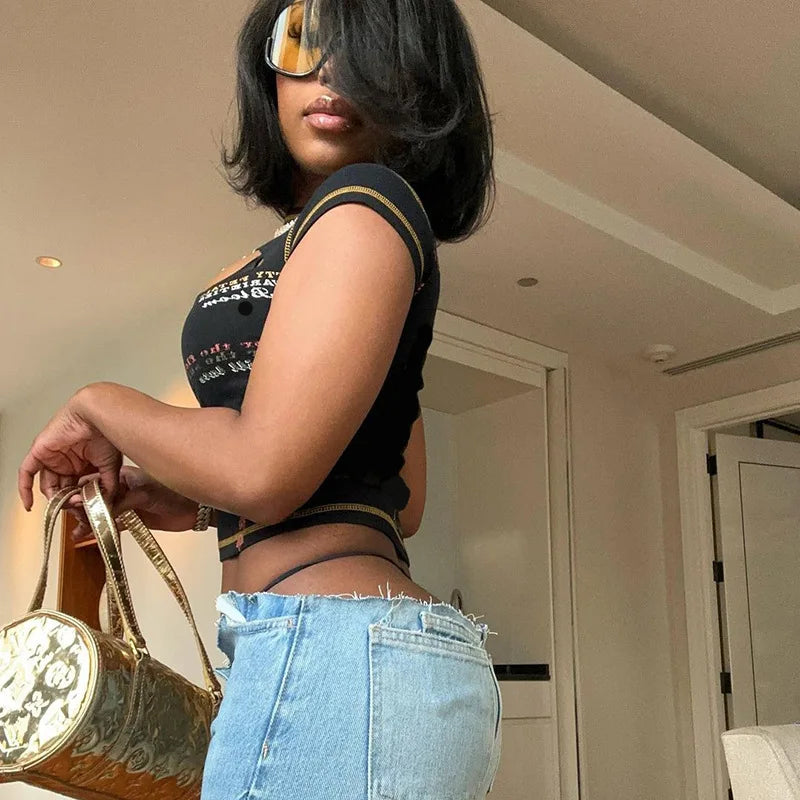Immerse yourself in the captivating allure of Y2K fashion with the elegant Black Cut Out Short Sleeve Crop Top from LEMISHION. This exquisite piece is designed for the bold woman who celebrates individuality and a touch of nostalgia.